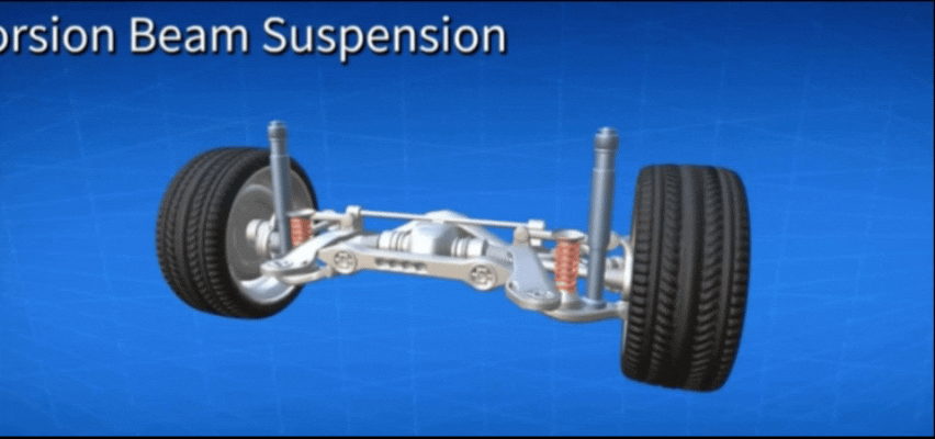 Obsahuje kovovú rúrku s gumenými šnúrami; kolesá sa pripájajú pomocou výkyvných ramien ku gumovej zostave. Nezávislý pohyb kolesa je umožnený prostredníctvom torznej deformácie gumy, pričom každé koleso funguje nezávisle.